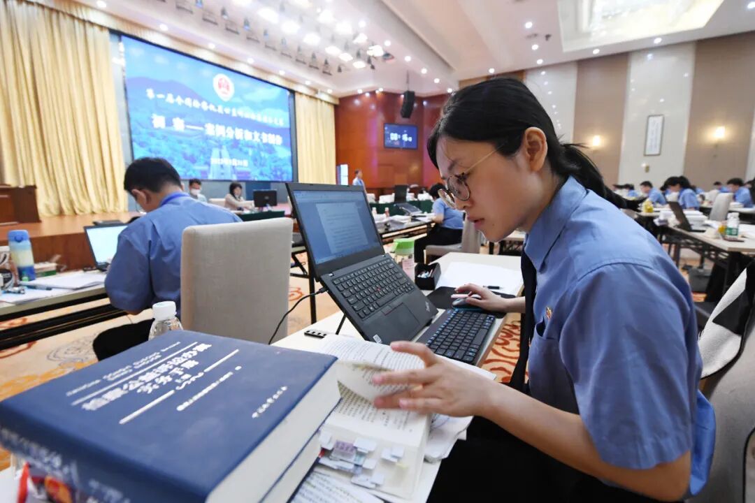 初赛分为两个环节,第一环节题目是案例分析和文书制作,比赛时长为7小时。图为参赛选手聚精会神答卷。