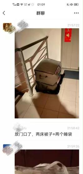 “我有折叠床一个,不用还,放门口了;我有充气床垫一个,被子一床,不用还,已放门口……”1月15日晚上10点多,这样的接龙在“博雅西园和谐议事”微信群里继续。