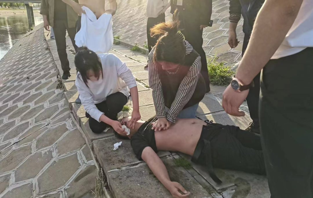 人捞上来后,钟文杰一阵心惊:“当时我看这个男子脸和身上都呈现出了青紫色,挺吓人的,想着要赶紧把他放平进行急救。”