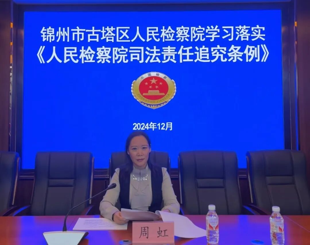 为深入推进全面从严管党治检,提高干警廉洁自律意识,严格落实司法责任制,12月3日下午,锦州市古塔区人民检察院召开全院警示教育大会,学习新修订的《人民检察院司法责任追究条例》。古塔区检察院党组副书记、副检察长周虹将新旧条文进行了对比分析,结合检察工作实际,对《条例》新修订内容作了详细解读。院党组成员、政治部主任迟长余主持会议,全体干警参加。